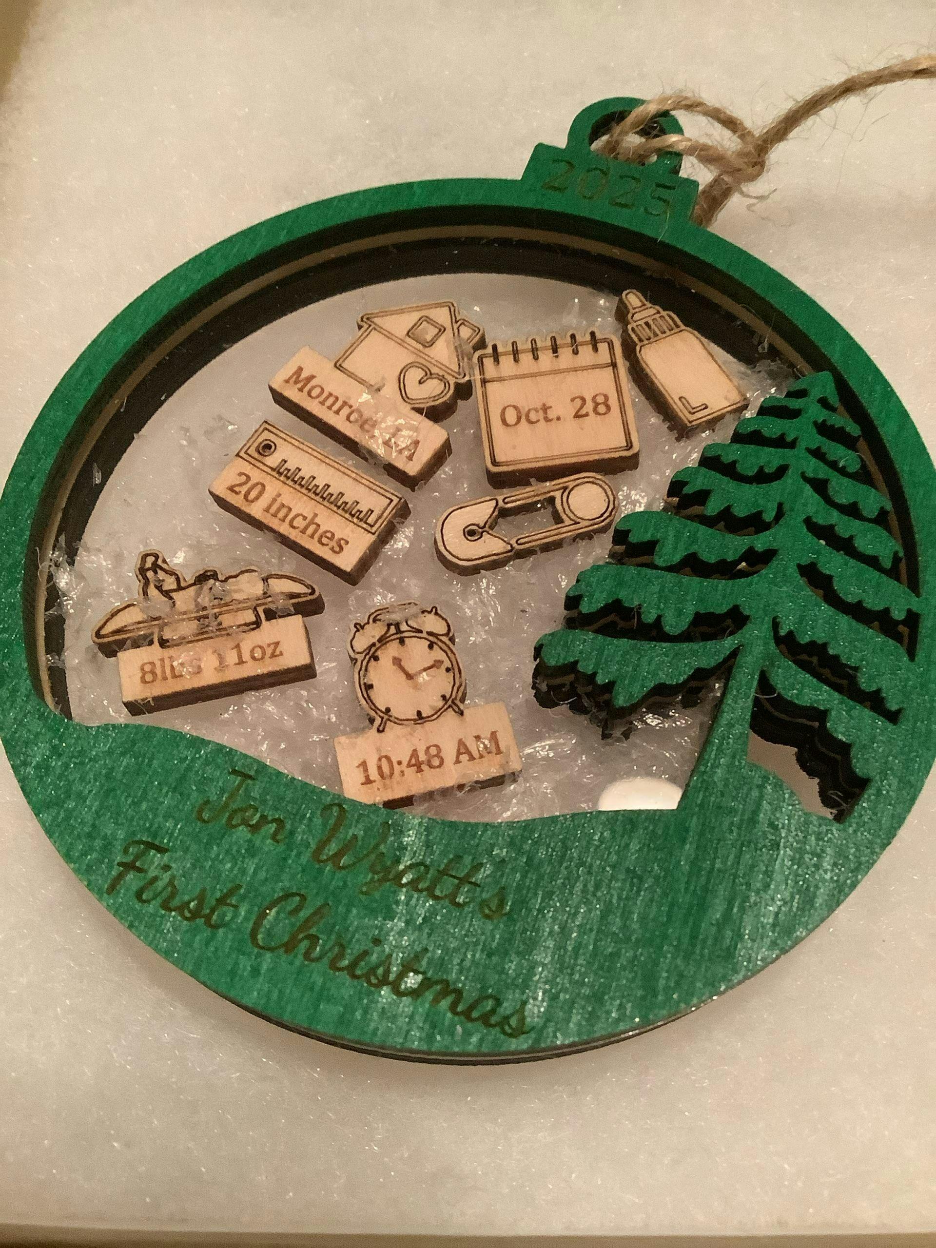 Each ornament can be customized with baby's name, date and time of birth, city/state, weight, length and year.