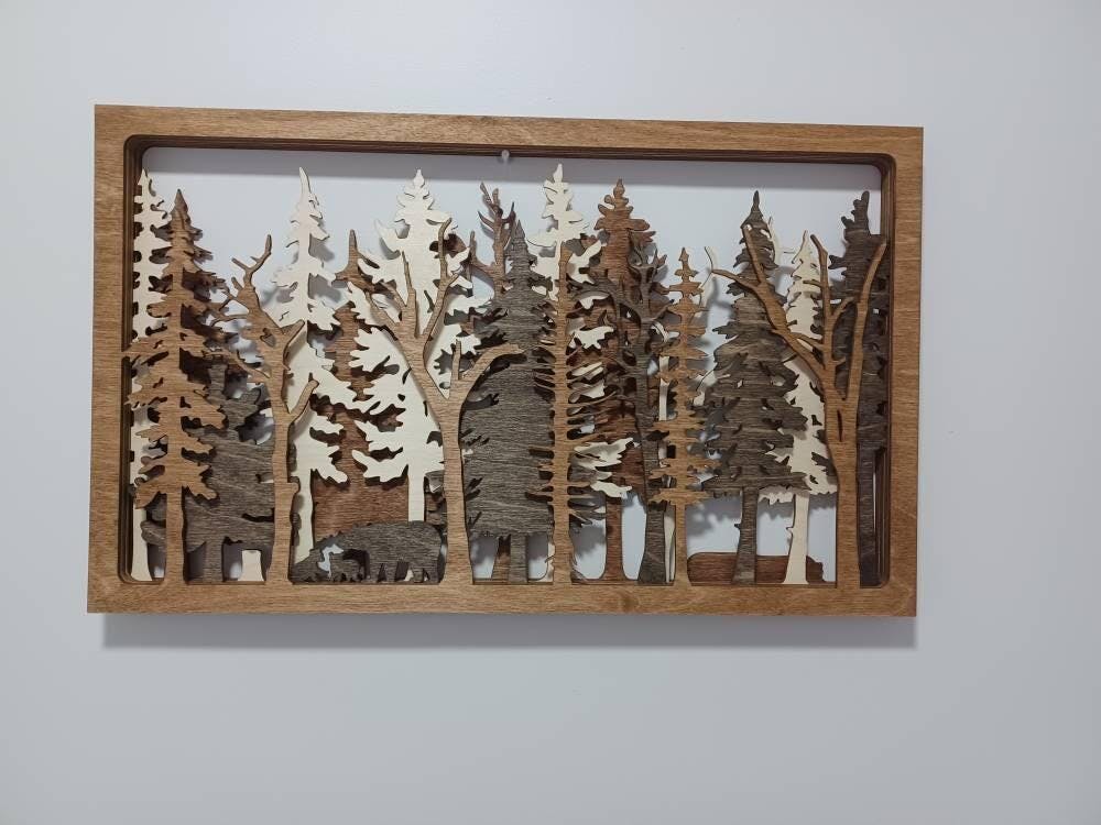 This is laser cut, multilayer wood art. It's made with Baltic Birch and each layer is stained a different color.